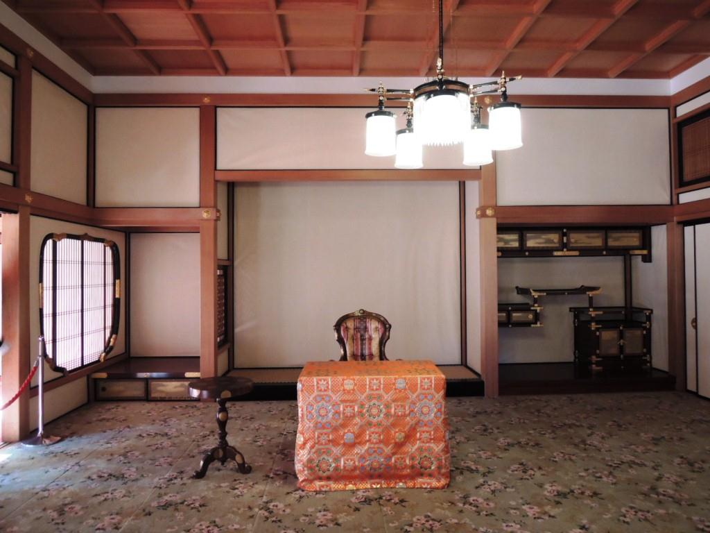 投稿日: 2012年11月18日ここは「木材の宝石箱」だ~っ 田母沢御用邸の謁見所 大正天皇の夏のご静養場所として造営された田母沢御用邸の中でもここはさすが他の部屋とは格が違います 柱や格天井・造作材は御料林から伐り出された木曽檜の中でも最高に吟味された木材を使用、柱は四方柾(四面全てが柾目)、違い棚は欅の玉木(根に近い部分で特殊な木目の出来る部分)、錺金物(かざりかなもの)にも最高の技術と素材が使われ「材木の宝石箱」言われる部屋です