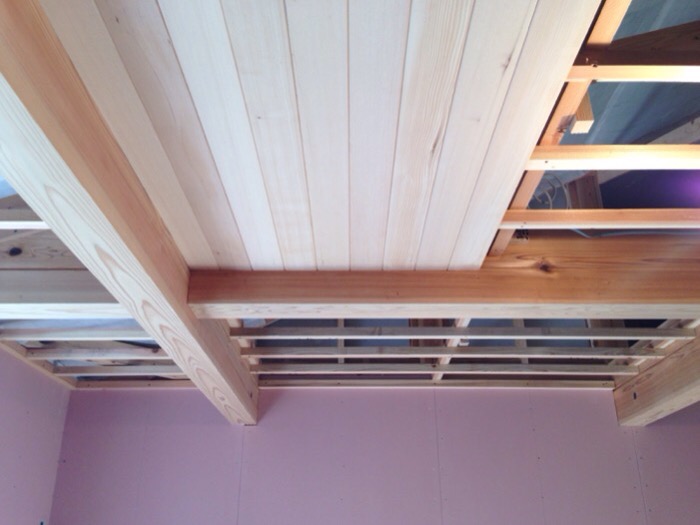 洋室の天井を板張りしてる様子です。