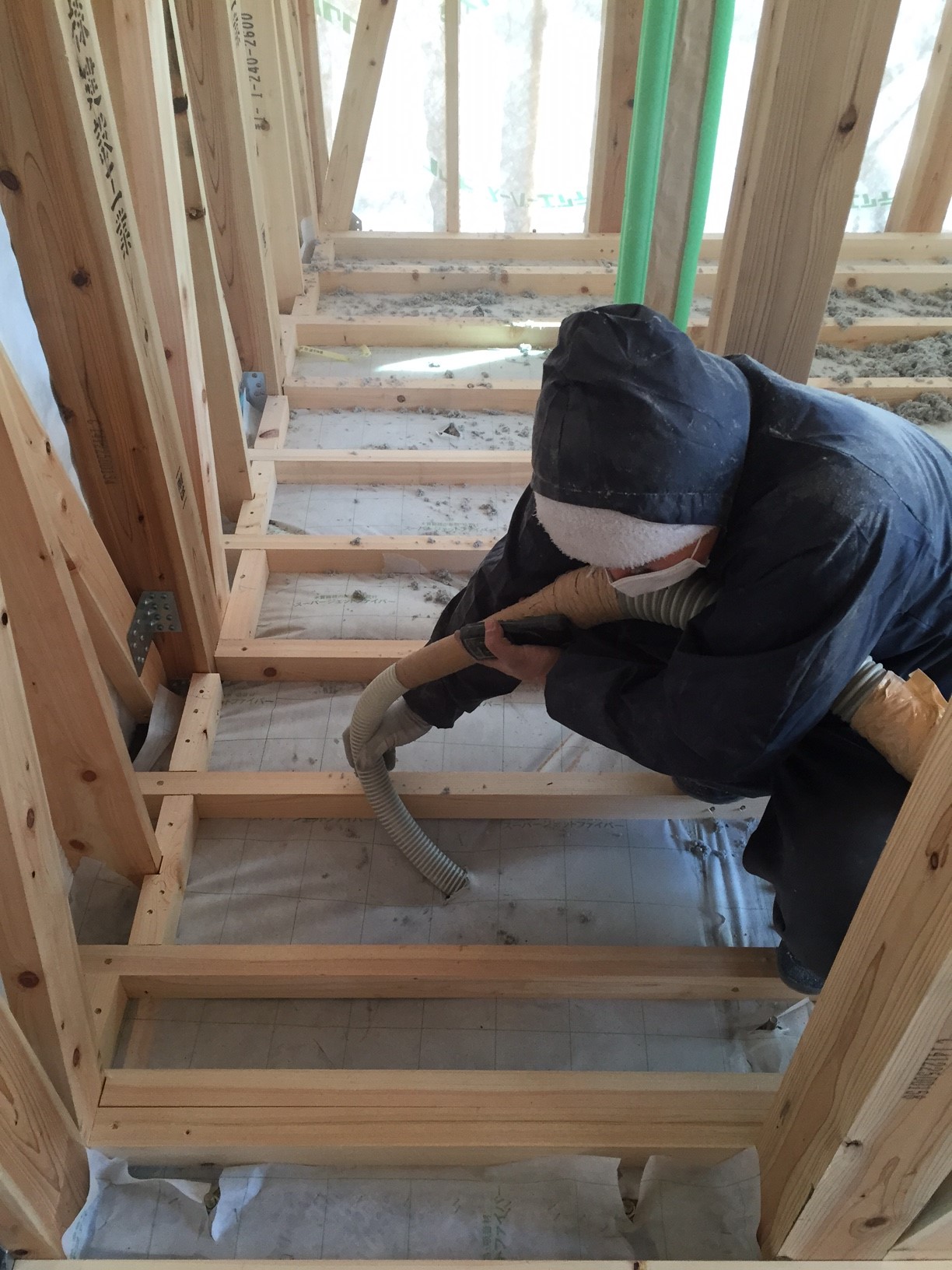 花田 断熱工事(セルロースファイバー)の様子構造現場見学会の様子構造現場見学会の準備モデルハウス新築工事の現場において今週末は 『構造現場見学会』を開催します