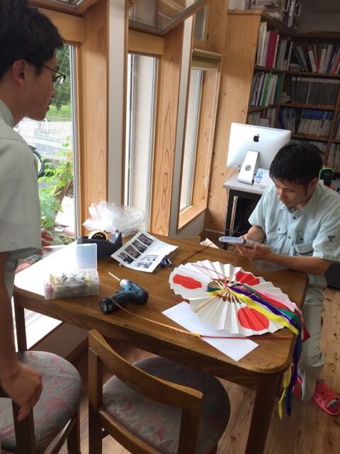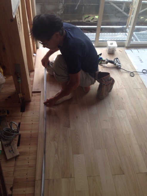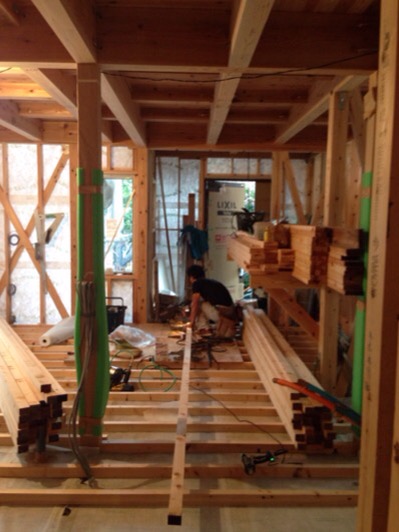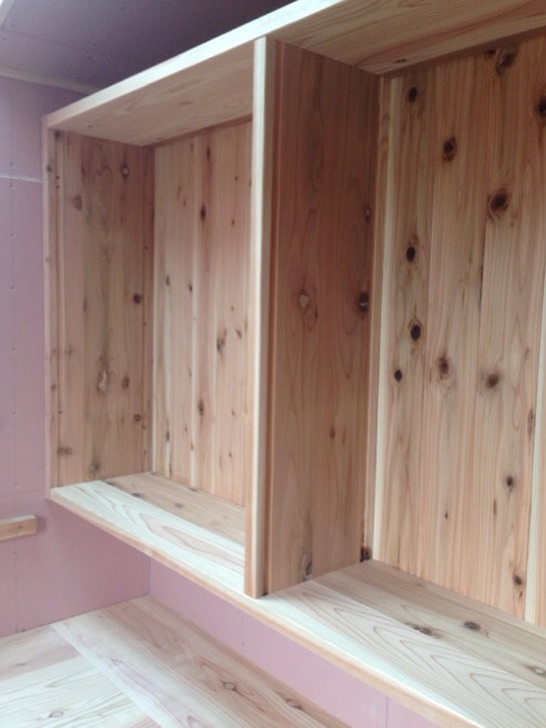 大工工事も終盤にはいり、棚を造ってます。材料は宮城県は栗駒産の杉の巾剥ぎ材を使用しています。